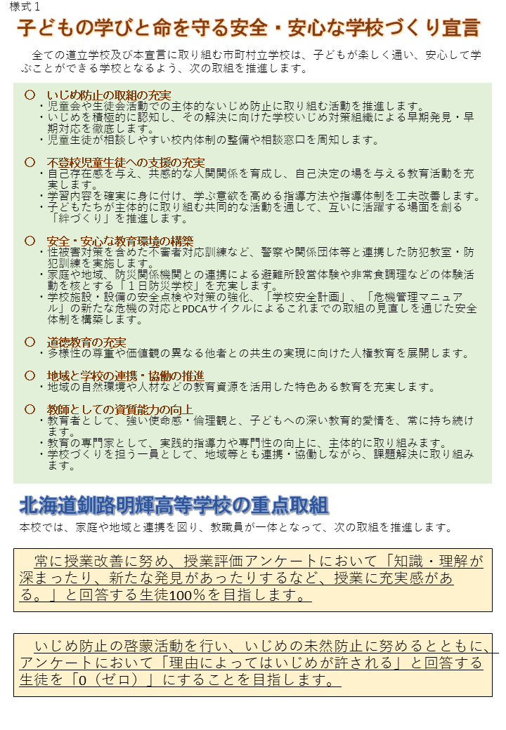 本校ホームページについて 学校評価 いじめ防止基本方針 子どもの貧困対策に関する教育支援 部活動に係る活動方針 子どもの学びと命を守る安全・安心な学校づくり宣言 自然災害緊急対応/災害用伝言ダイヤル 勤務時間外の電話対応について 学校閉庁日の設定について 病気療養中等の生徒に対する教育保障(北海道教育委員会ウェブページ)